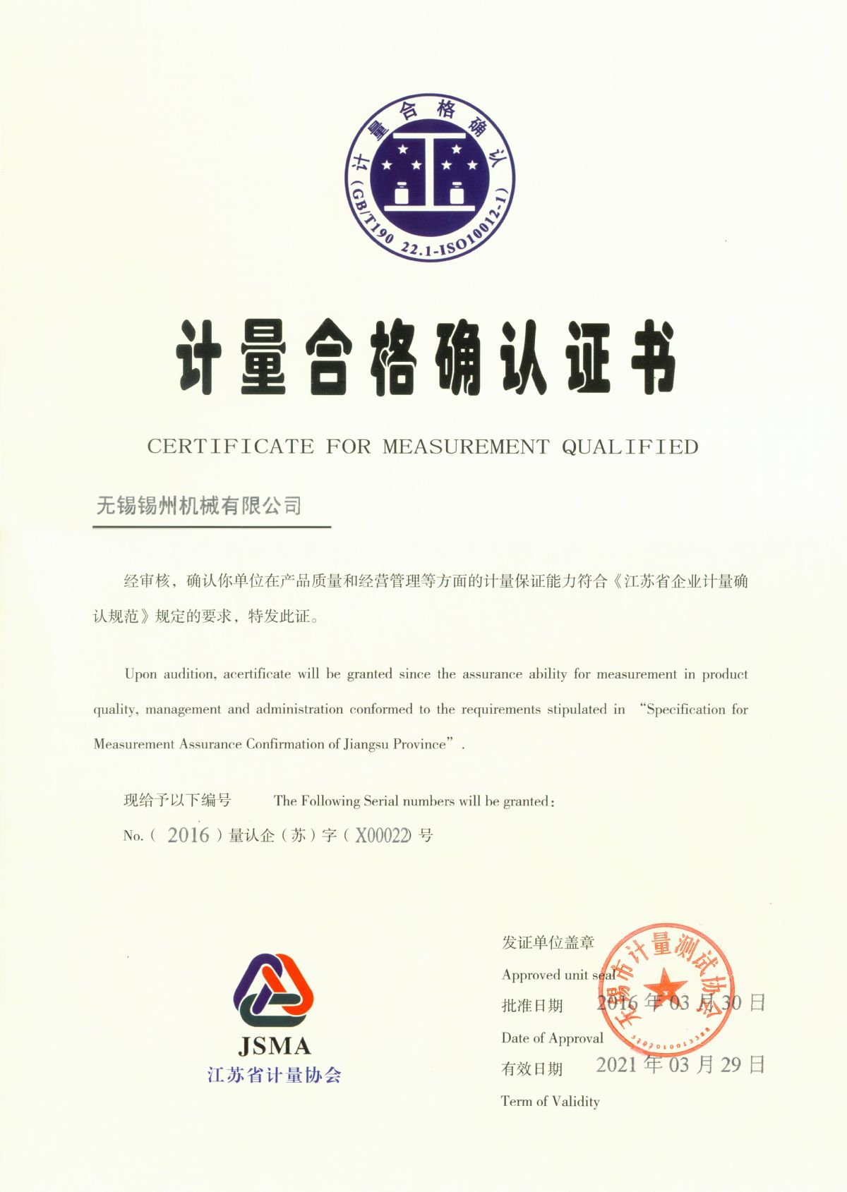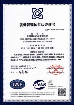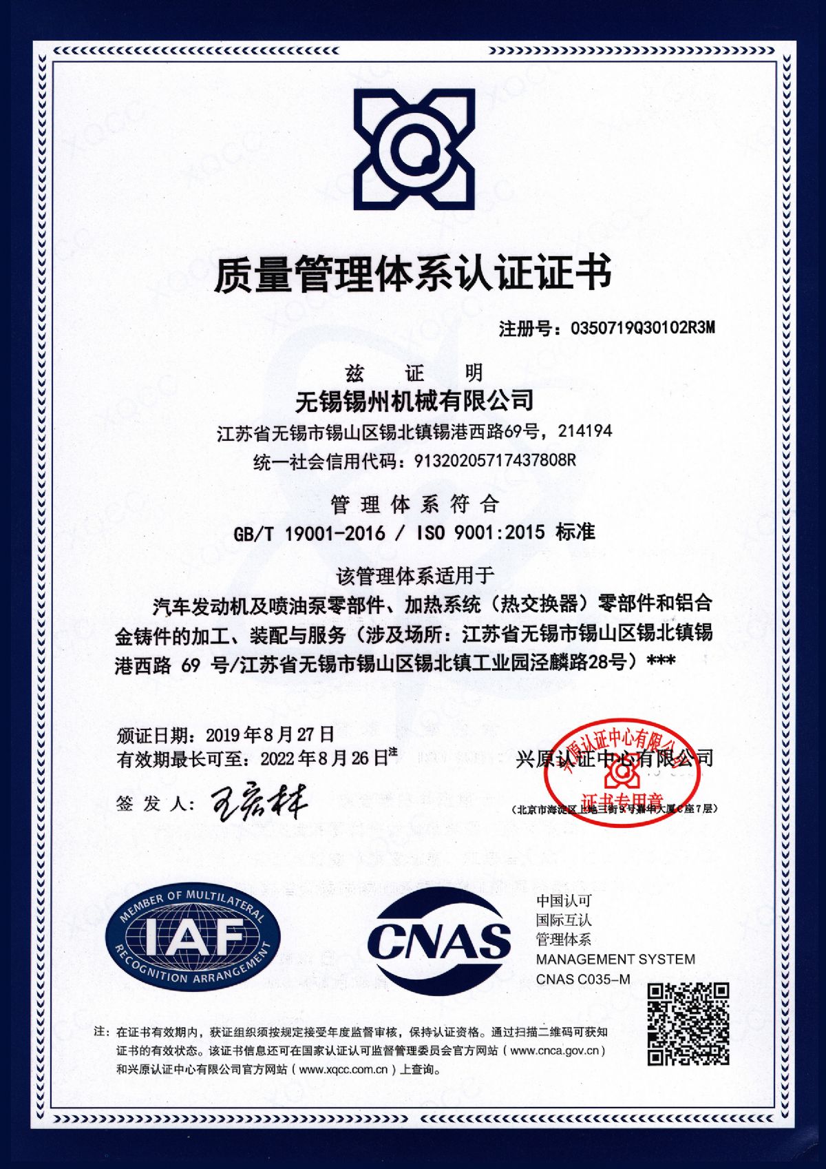 “ 以質量求生存,以管理增效益”是錫州機械堅定不渝的經營理念;“質量第一、客戶至上”是錫州機械堅持不懈的追求;“ 以人為本,鑄就優(yōu)質產品, 精益求精,增強顧客滿意”是錫州機械持之以恒的質量方針。 2001年7月公司通過ISO9001:2000質量體系認證, 2005年9月通過ISO/TS16949質量體系認證。公司于2007年7月通過產品ASME認證。 通過開展以產品質量為中心的企業(yè)管理,公司以先進的生產檢測設備、完善的質量保證體系、嚴密的產品開發(fā)體系、嚴格按照標準開展產品生產管理,并開展6S現(xiàn)場管理,竭盡全力創(chuàng)造一個比較清潔、健康、安全的環(huán)境,全方位地滿足國內外客戶的要求。